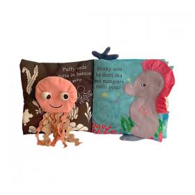 Un morbido libro di stoffa dedicato agli amici Ocean Buddies, ricco di piccole attività che cattureranno l’attenzione del tuo bambino. Flippy la tartaruga si nasconde nel suo guscio, Blinky il cavalluccio marino ha un sonaglio, Humpy la balena custodisce un tessuto stropicciato, Bubbly il delfino suona con il suo squeaker, Crawley il granchio propone un bottone a pressione rimovibile e Puffy il polpo si trasforma in una simpatica marionetta per aggiungere ancora più gioco e fantasia. Leggero, sicuro e facile da maneggiare, è il primo libro ideale: stimola udito e concentrazione grazie alle pagine fruscianti e incoraggia nei piccoli la curiosità e l’amore per le storie.