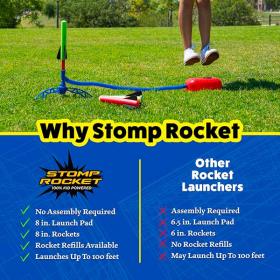 Pronti a far volare il divertimento… anche al buio? Stomp Rocket Junior Glow con 4 razzi porta il gioco all’aperto a un altro livello: basta inserire il razzo sulla rampa, fare un salto sul cuscinetto e guardarlo sfrecciare in aria fino a 30 metri di altezza. I 4 razzi si illuminano anche al buio, rendendo ogni lancio ancora più sorprendente e spettacolare anche nelle sere d’estate. Nessuna batteria necessaria: funziona tutto grazie all’energia dei bambini, che saltando attivano il lancio in modo semplice e sicuro.