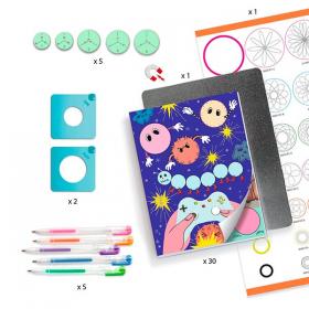 Una confezione da disegno per realizzare splendide spirali colorate e completare le tavole proposte nel blocco di 30 pagine, raggruppate in 10 temi diversi. Un'attività classica rivisitata da Djeco grazie a strumenti pratici che permettono di realizzare le spirali senza che il foglio si muova! I bimbi posizionano il foglio sulla piastra di metallo, poi posano sul foglio la cornice con la calamita nella quale inseriscono la ruota dentellata. I bimbi con le penne gel realizzano dei cerchi per disegnare con facilità delle spirali senza dover tener ferma la cornice. Contenuto: 1 blocco di 30 fogli illustrati (21 x 28 cm), 1 piastra di metallo (21 x 28 cm), 2 cornici con calamita e 5 ruote di plastica, 5 penne stilo gel, 1 libretto delle istruzioni per imparare a comporre le proprie spirali, 1 libro di esempi a colori.