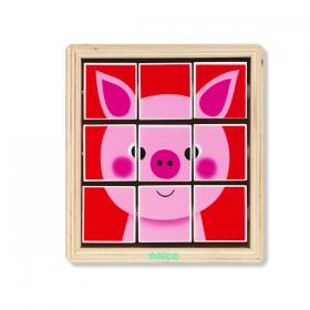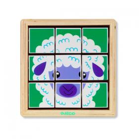 Si tratta di un puzzle divertente con una cornice di legno! I bambini, posizionando il gioco su una superficie piana, possono ruotare le varie forme per comporre uno dei tre animali: pecora, mucca o maiale. Le tessere, facili da girare, stimolano la manualità del bambino. Non c'è rischio che le tessere si perdano, poiché sono saldamente attaccate alla cornice di legno.