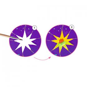 Il kit contiene: 8 carte illustrate (20 x 20 cm - 4 modelli x 2), 1 tavolozza di tempere in 8 colori, 1 pennello, 1 libretto di istruzioni a colori.