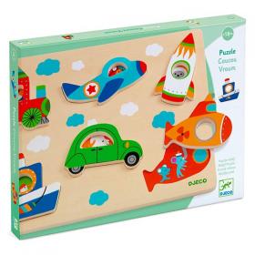 Coucou-vroum è un Puzzle di Legno sul tema dei veicoli. Sotto ogni pezzo a forma di veicolo si trova l'illustrazione di un personaggio. Sollevando un pezzo, i bambini scoprono chi conduce il veicolo. I veicoli possono restare anche in piedi, per un gioco ancora più divertente e per inventare infinite storie.